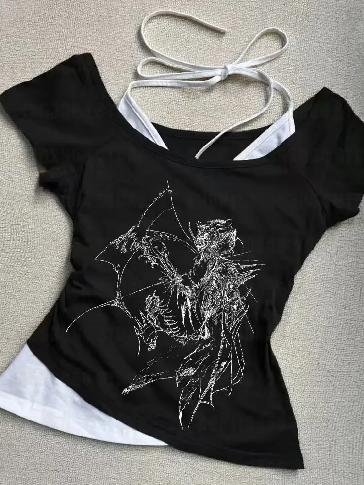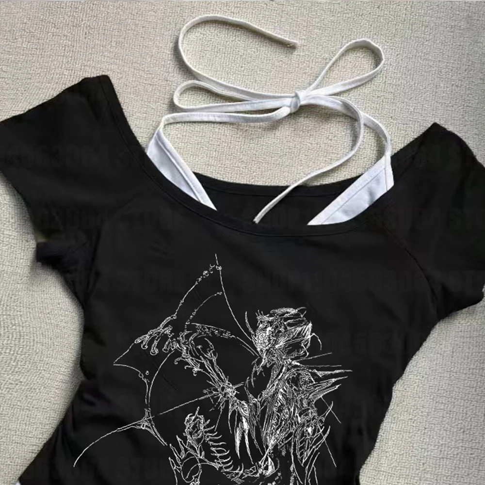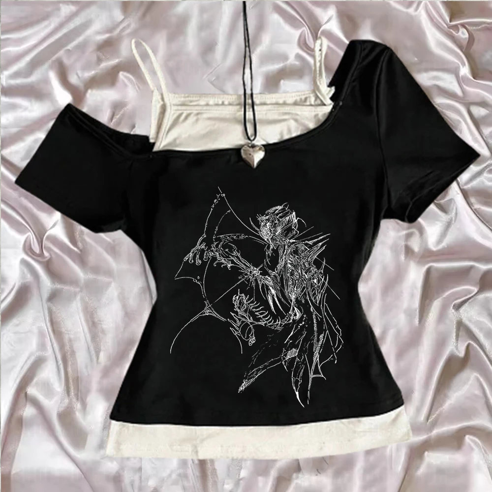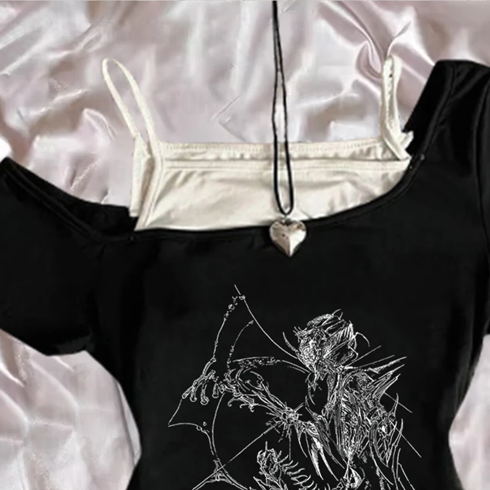 Edgy Y2K corset crop top with suspenders featuring cartoon appliques. Made from slightly stretchy polyester blend. Perfect for summer gothic style.