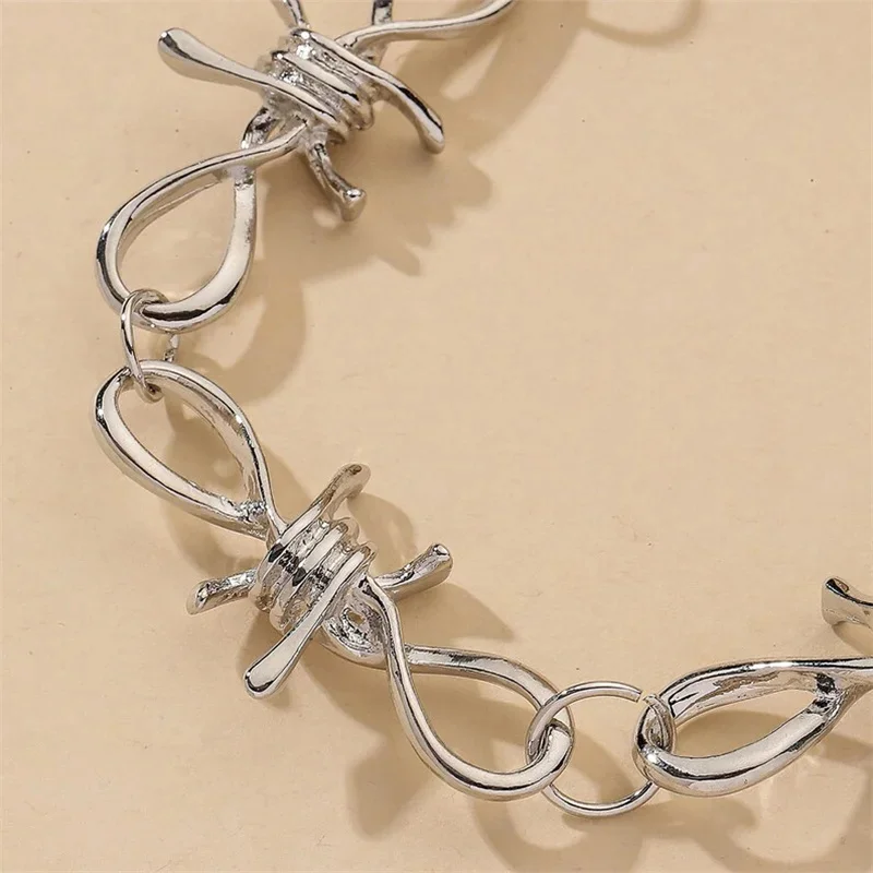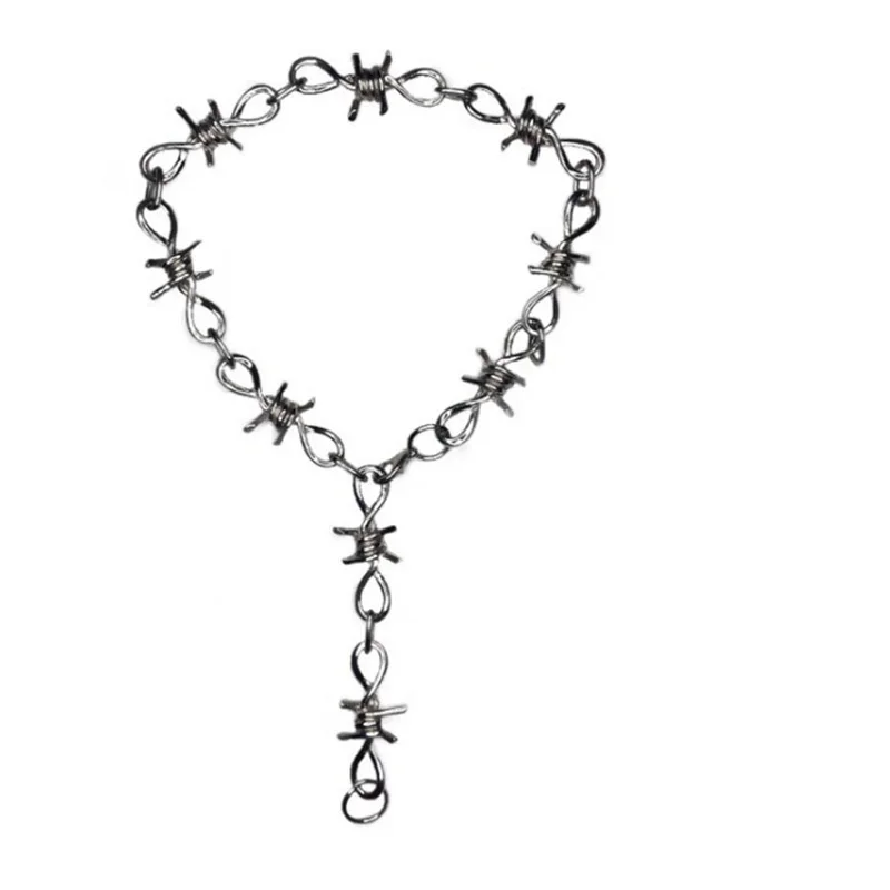 Edgy barbed wire choker necklace made from zinc alloy. Perfect for those who dare to make a bold fashion statement. No harmful chemicals and stainless steel.