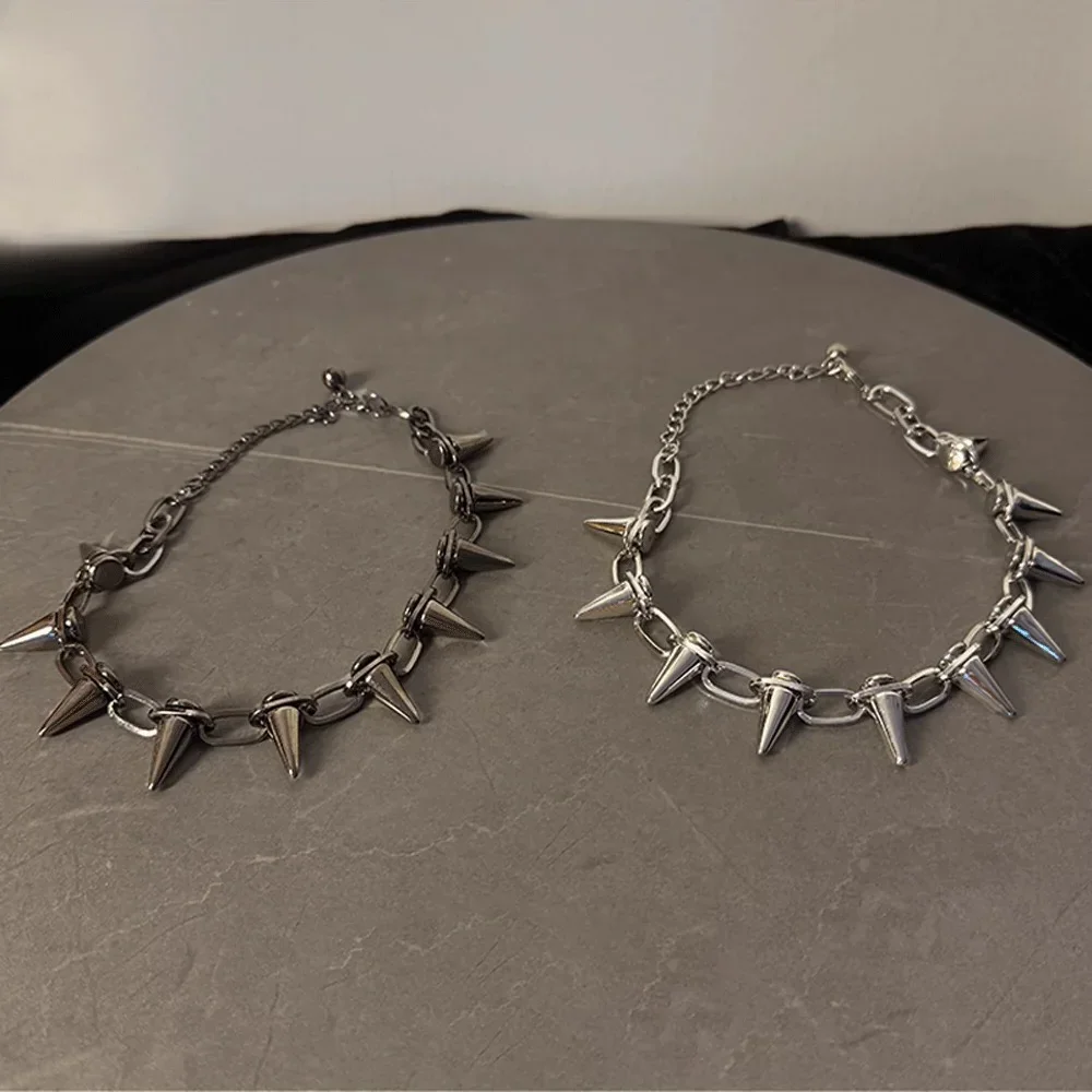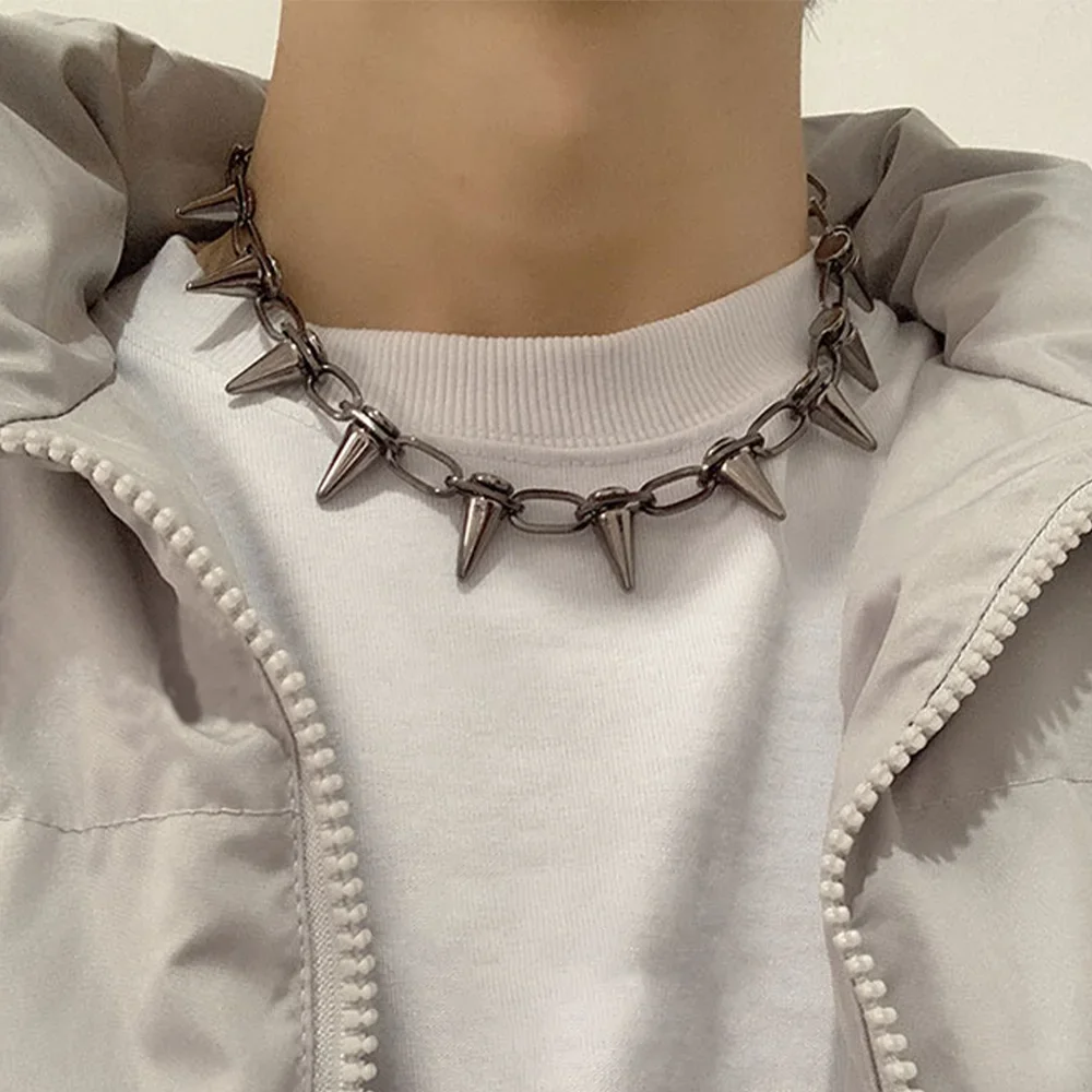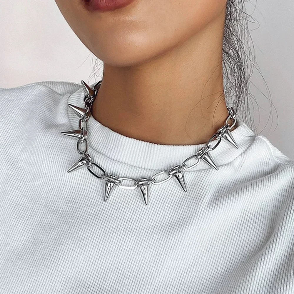 Edgy punk necklace in gold, silver, or gun black alloy with geometric rivet design. This 35+12cm hip-hop statement piece adds rebellious flair to any outfit. Perfect for parties, clubs, or street style. Zinc alloy construction for durability with a bold attitude.