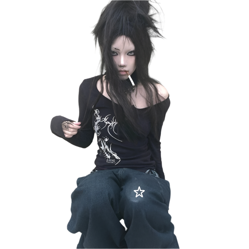 Edgy button-up tee with tattoo prints and gothic vibes. Features O-neck design, stretchy cotton-poly blend, and hand-painted patterns. Perfect for creating bold spring/summer grunge looks.