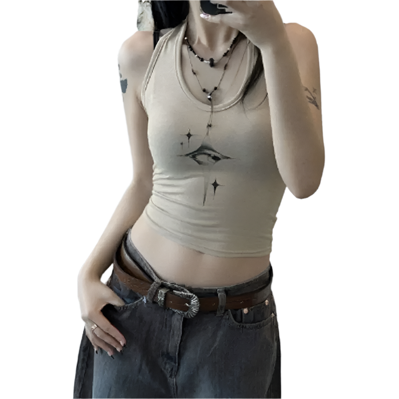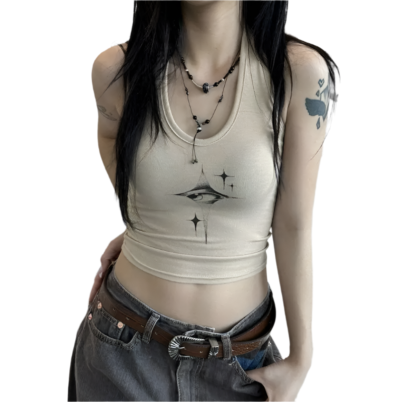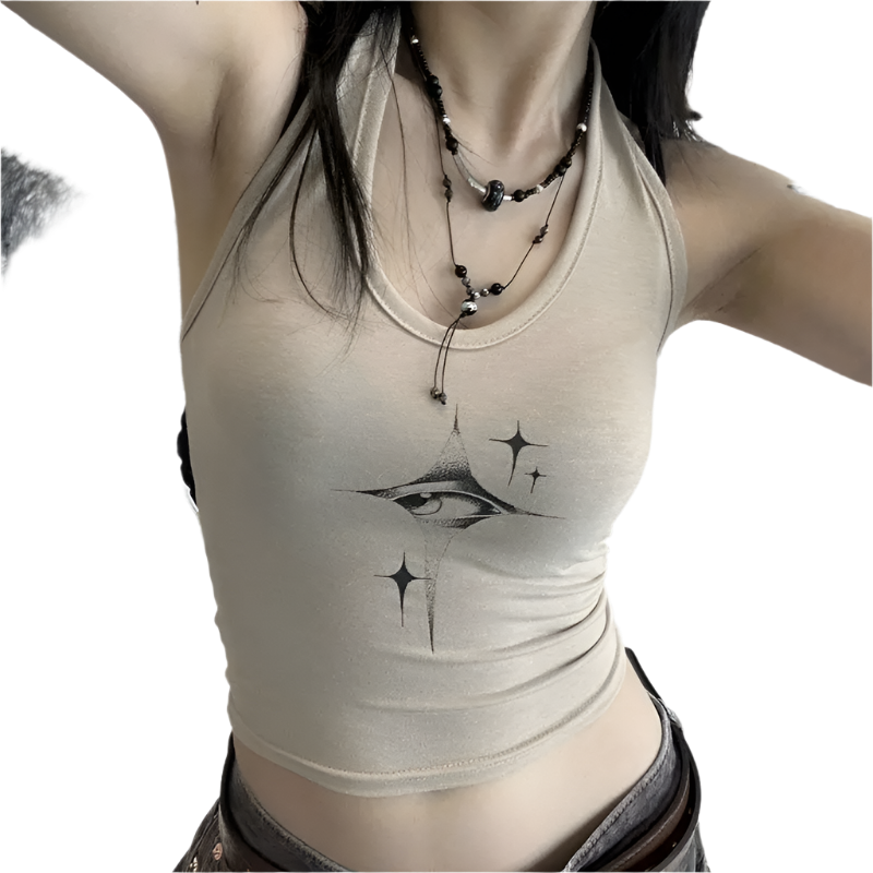 Unleash your rebellious side with this daring Y2k Devil's Eyes Retro Print Hanging Neck Vest. This cotton short top features a bold print pattern with medium stretch for a body-hugging fit. Perfect for winter layering with zero decorative frills—just pure 90s vintage attitude. This women's casual piece demands attention while keeping your silhouette provocatively slim and slimming. No high-concern chemicals, just raw fashion energy.