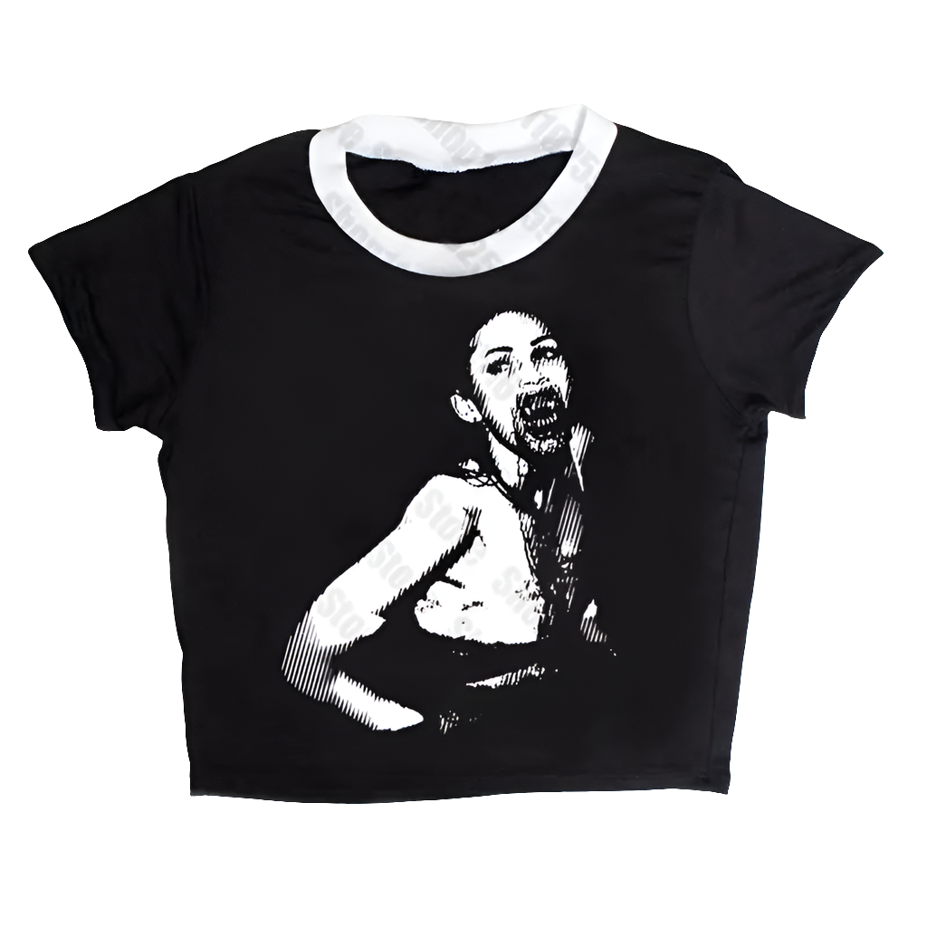 Edgy Y2K crop tee with slight stretch. Made from polyester with anime pattern. Short-sleeved streetwear perfect for summer rebellion. Regular fit with knit construction.