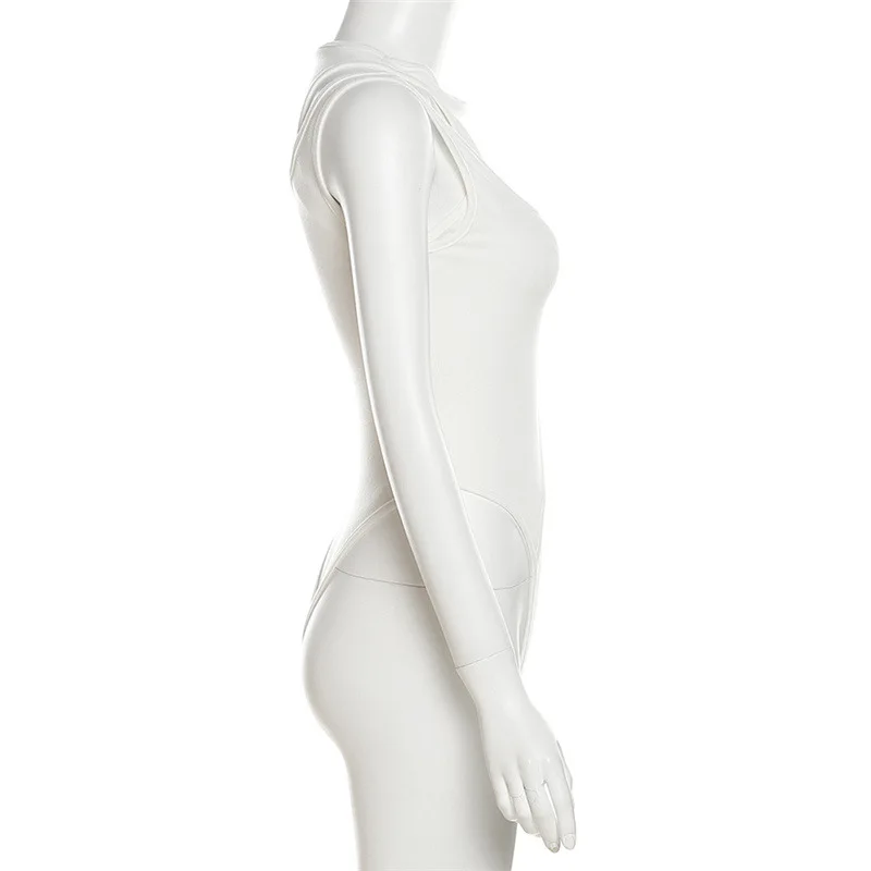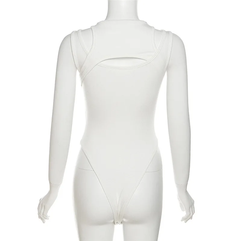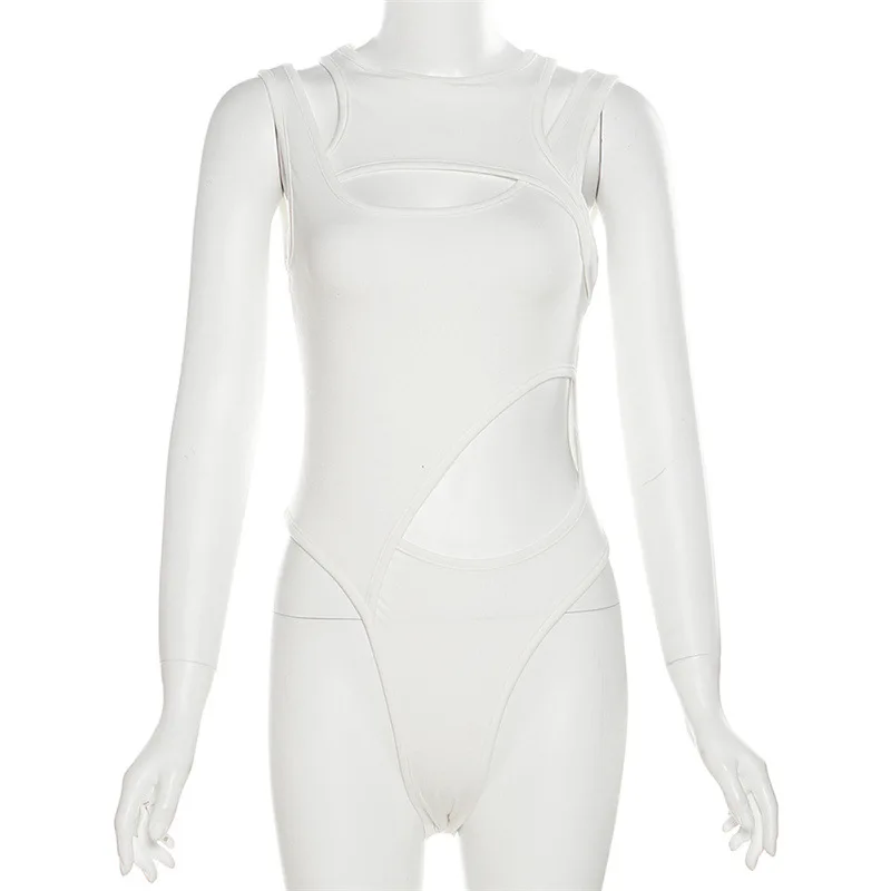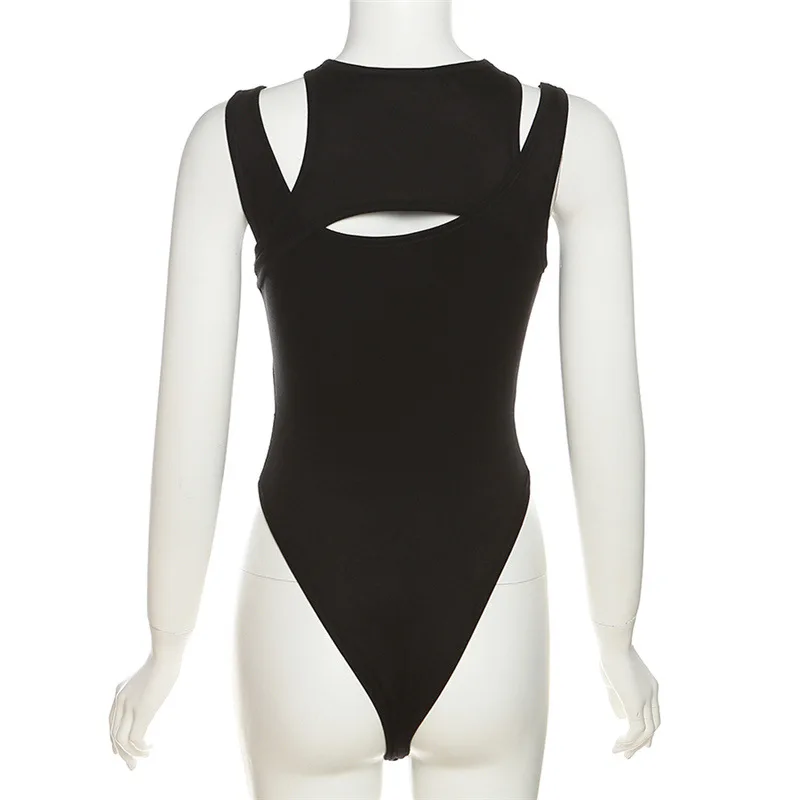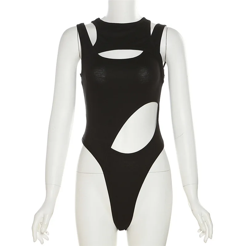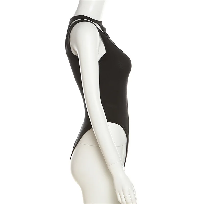 Edgy junior bodysuit with cut-out design. Made from polyester/spandex blend with slight stretch for a skin-tight fit. Perfect for making a bold statement in warm weather. Gothic-inspired style that demands attention.