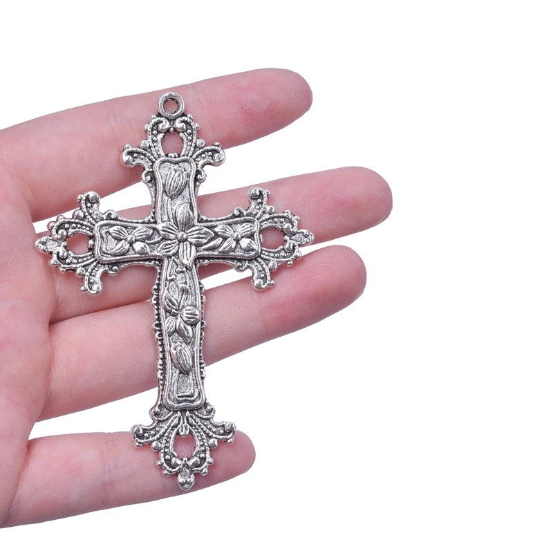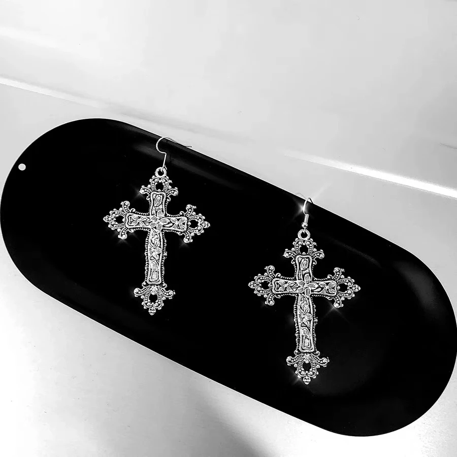 Vintage cross earrings with bold Baroque Gothic styling. These metal alloy statement pieces bring edgy Y2K flair to any outfit. Perfect for punks, goths, and fashion rebels looking to make a dramatic statement. Ancient silver finish with distinctive cross design for everyday rebellion or special occasion darkness.