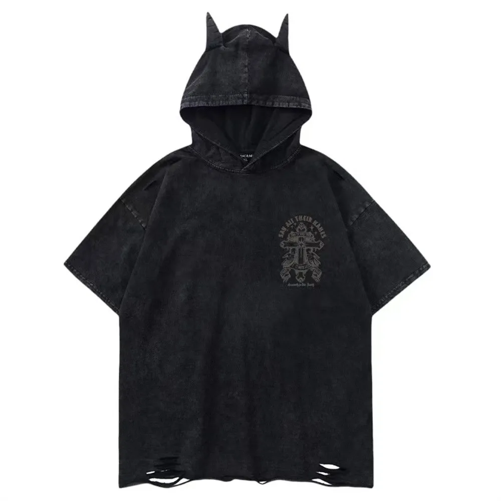 This Devil Horn Hooded Tee delivers edgy streetwear attitude with its punk-inspired design. This loose-fit black top features distinctive holes, printed art patterns, and devil horn details that scream Y2K cyber rebellion. Perfect for those who dare to stand out in the alternative fashion scene.
