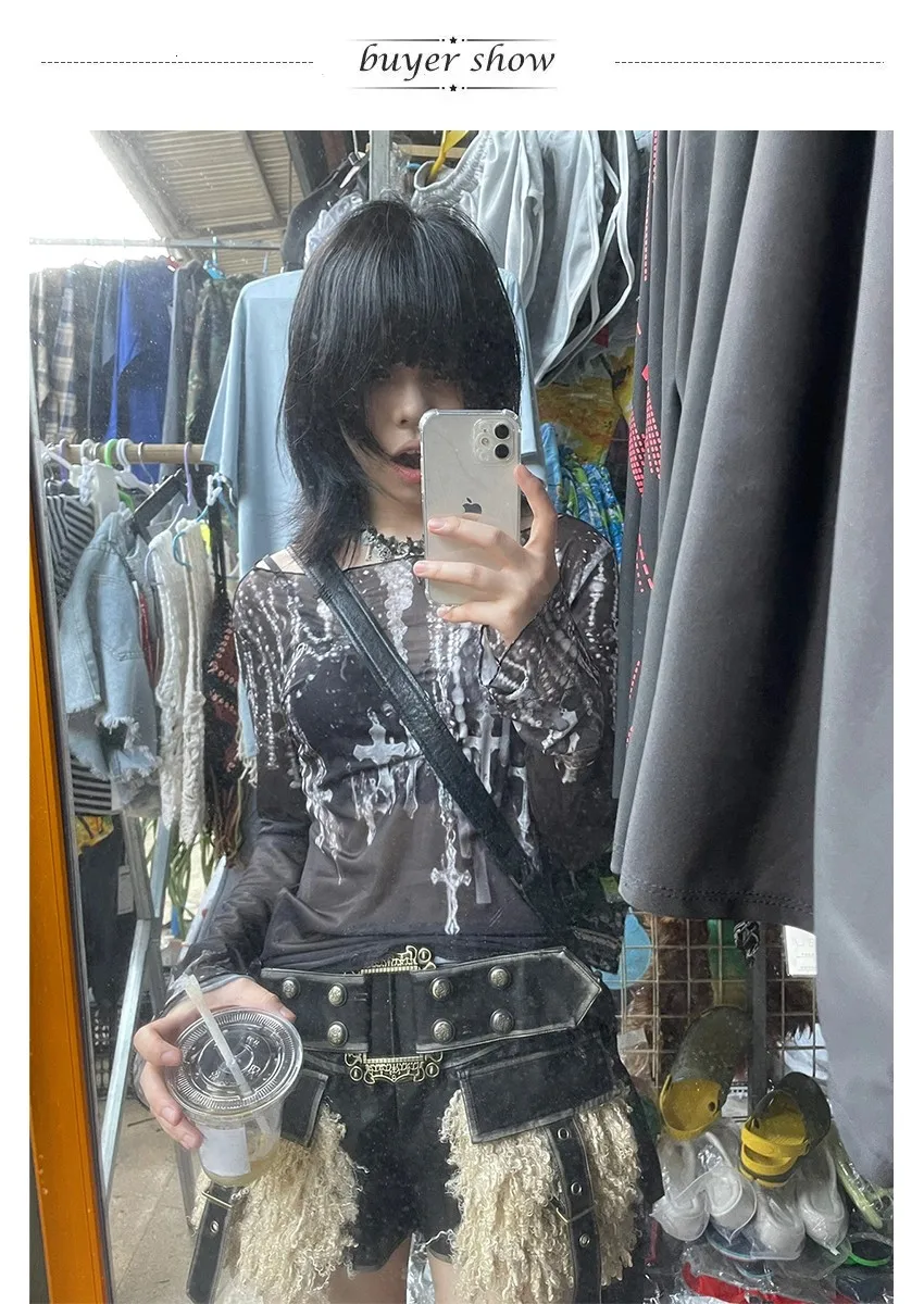 Unleash your rebellious side with our Karrram Grunge Mesh Top. This all-season O-neck tee features provocative sheer fabric with edgy tattoo prints. Crafted from stretchy cotton-spandex blend for a body-hugging fit that reveals just enough. Perfect for layering or making a bold statement on its own. Embrace the Harajuku-inspired Gothic aesthetic that defies conventional fashion rules.