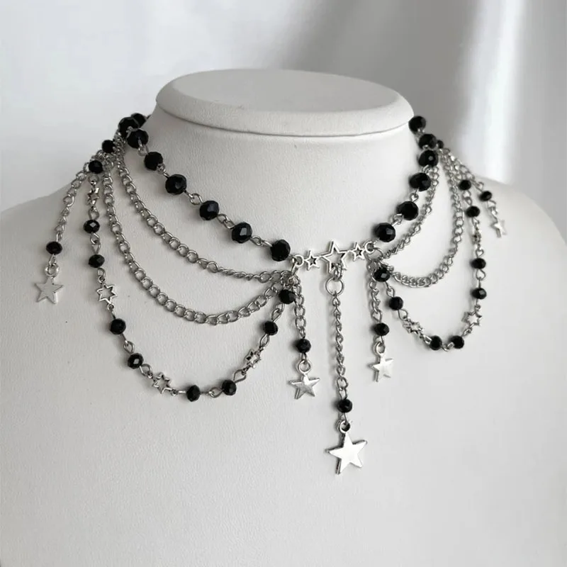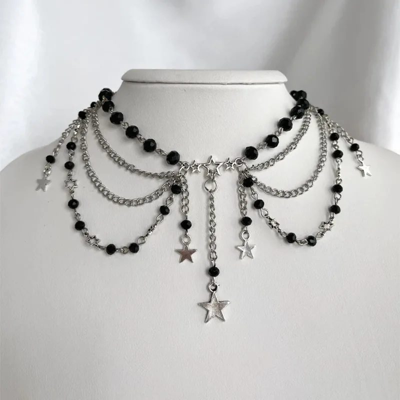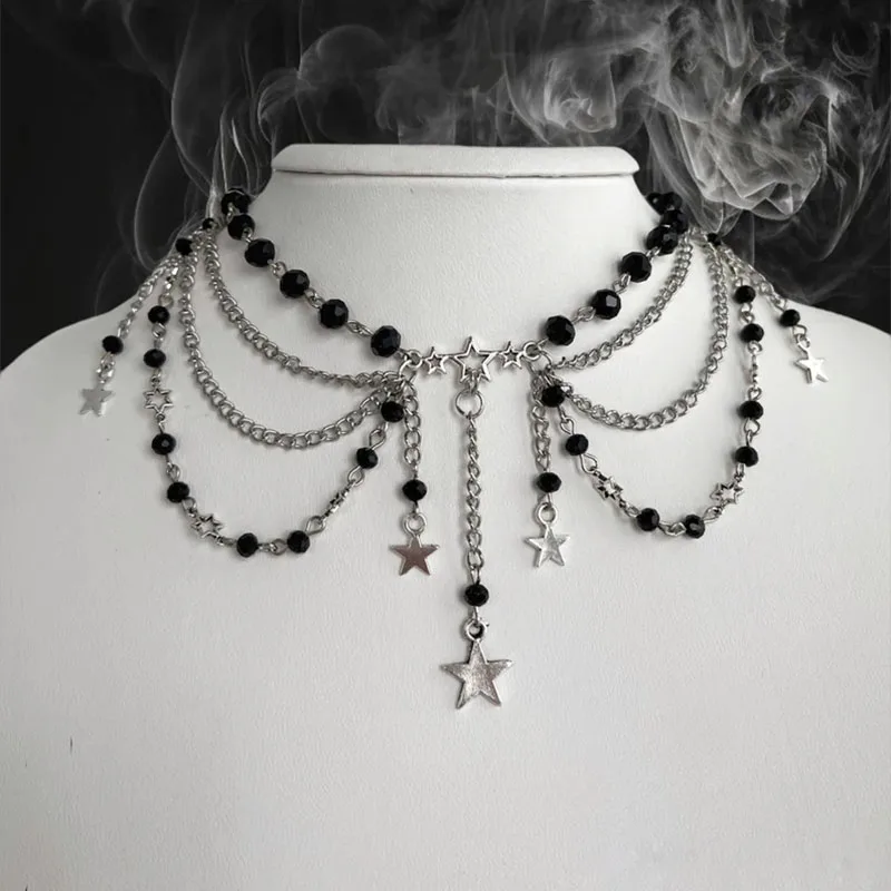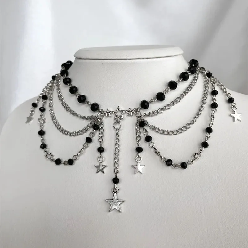 Edgy star pendant necklace with crystal beads in a fairy grunge style. Features adjustable zinc alloy chain (38-45cm) with lobster clasp. Perfect for making a bold statement at parties with its classic yet rebellious aesthetic.