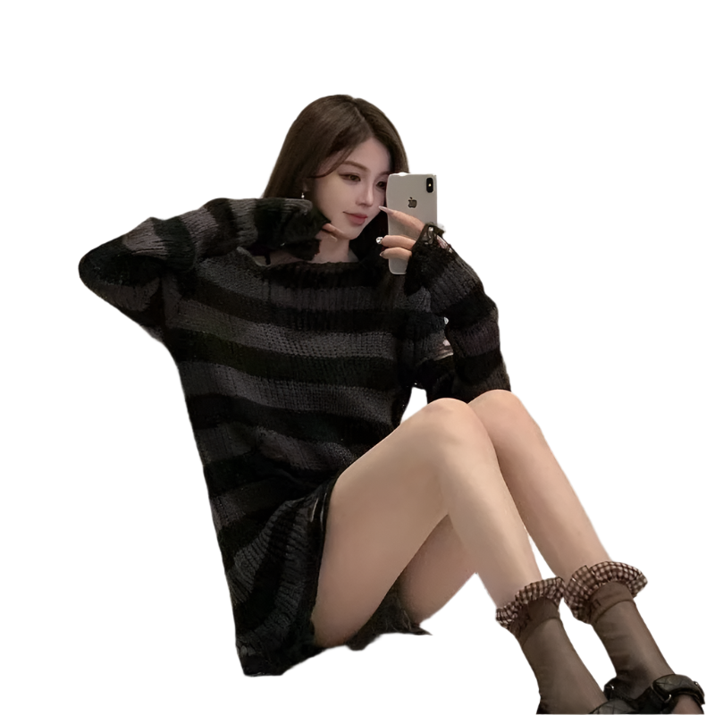 Embrace the y2k punk aesthetic with this ultra-edgy striped sweater! Features cool hollow-out detailing and a broken jumper design that screams rebellious vibes. The loose-fit O-neck silhouette in dark streetwear style is perfect for summer layering. Made from high-stretch acrylic blend fabric that's totally lightweight. Rock this 45-inch long unisex top with cargo pants or a mini skirt for maximum 2000s attitude! One size fits all!