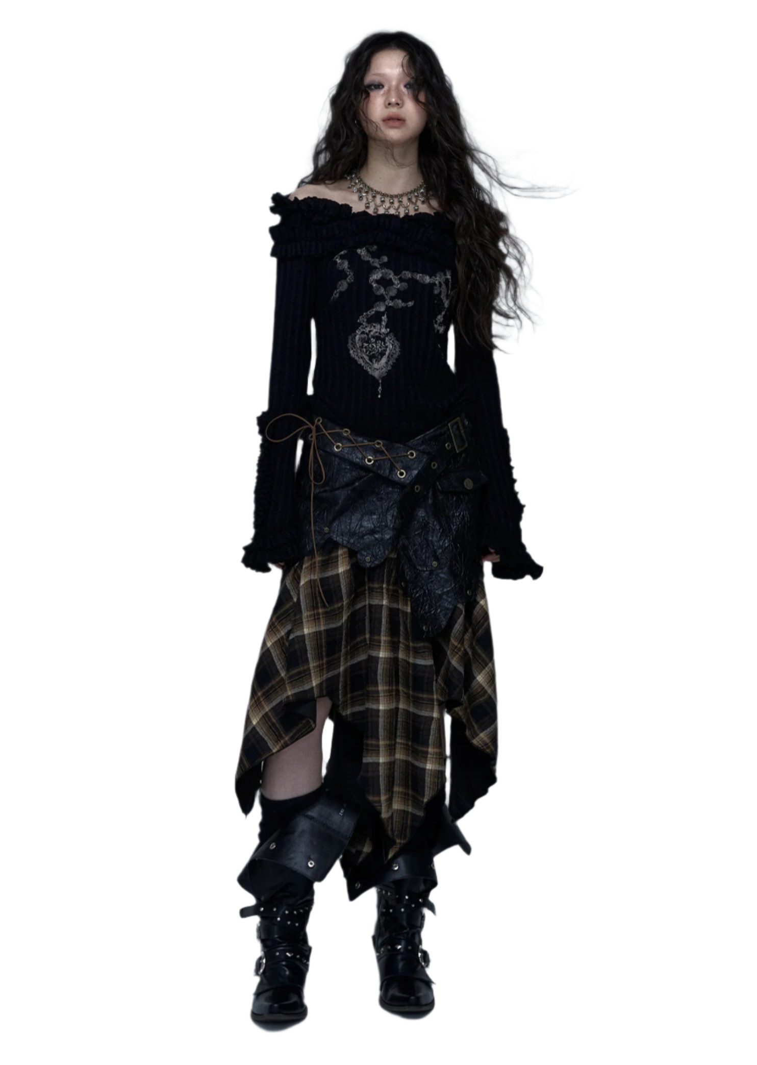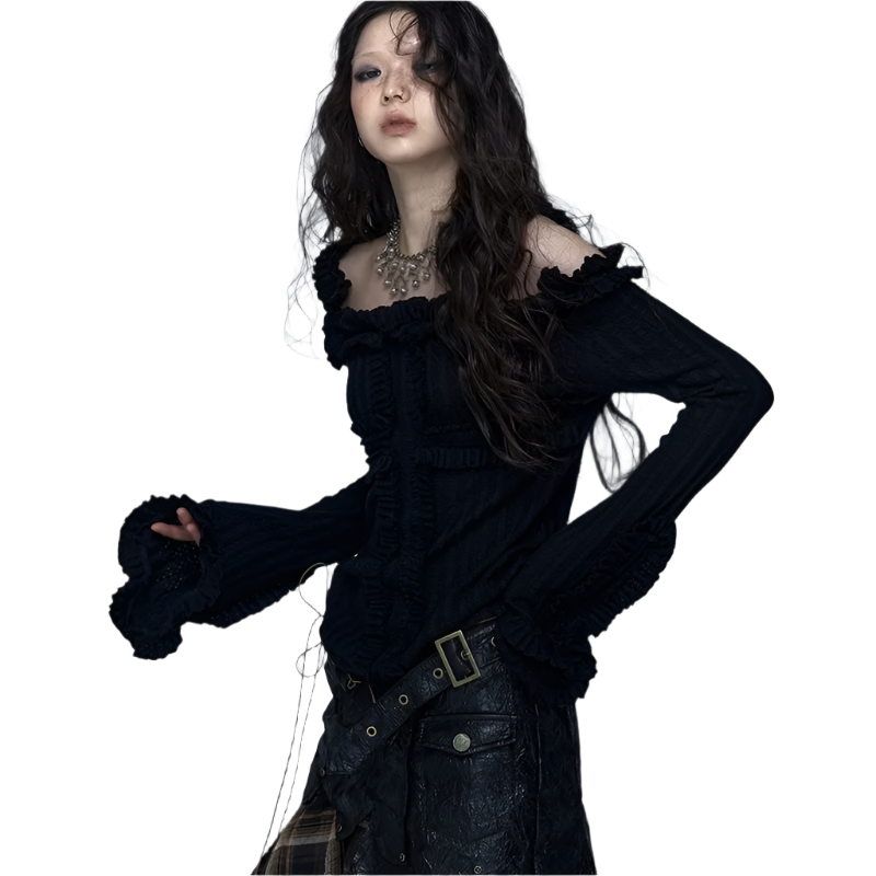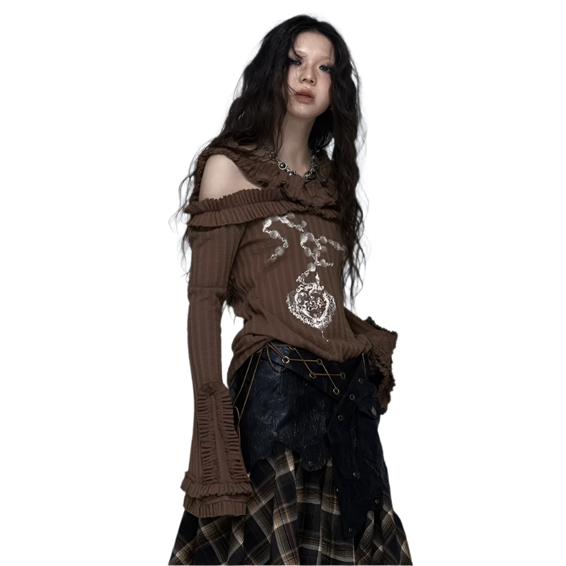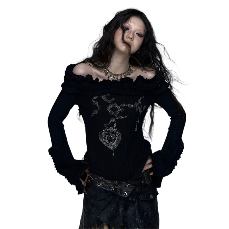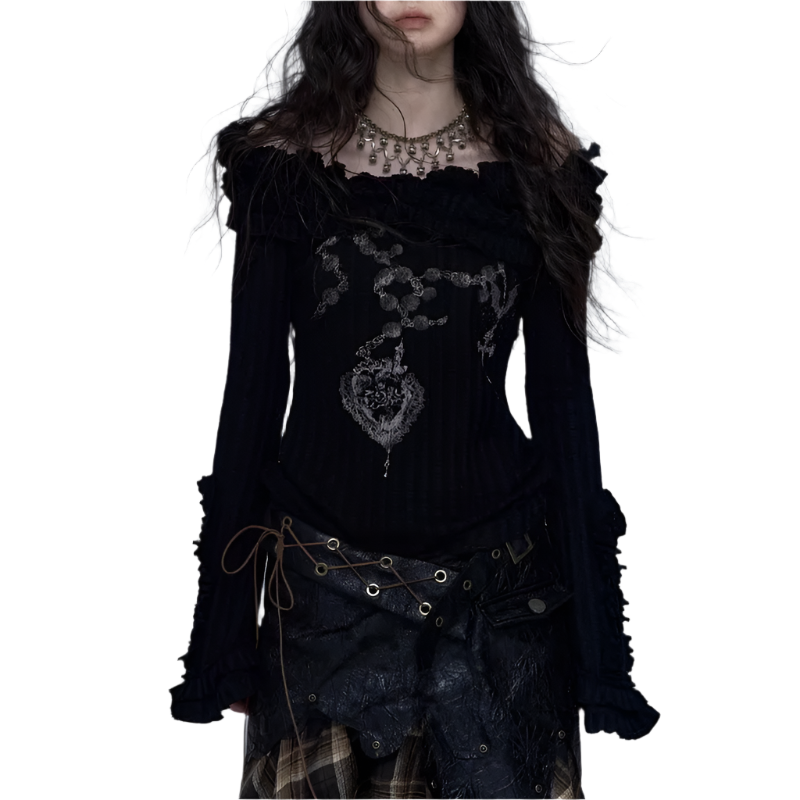Embrace your inner rebel with this Off Shoulder Knitted Top! This totally rad slash neck tee features a vintage tattoo print on high-stretch cotton fabric. The ribbed black design with edgy hand-painted details gives major wasteland punk vibes. Perfect for your autumn/winter Y2K wardrobe with its full petal sleeves and gothic aesthetic. Slay all day in this ultra-stretchy, regular-length piece that's giving pure early 2000s energy!
