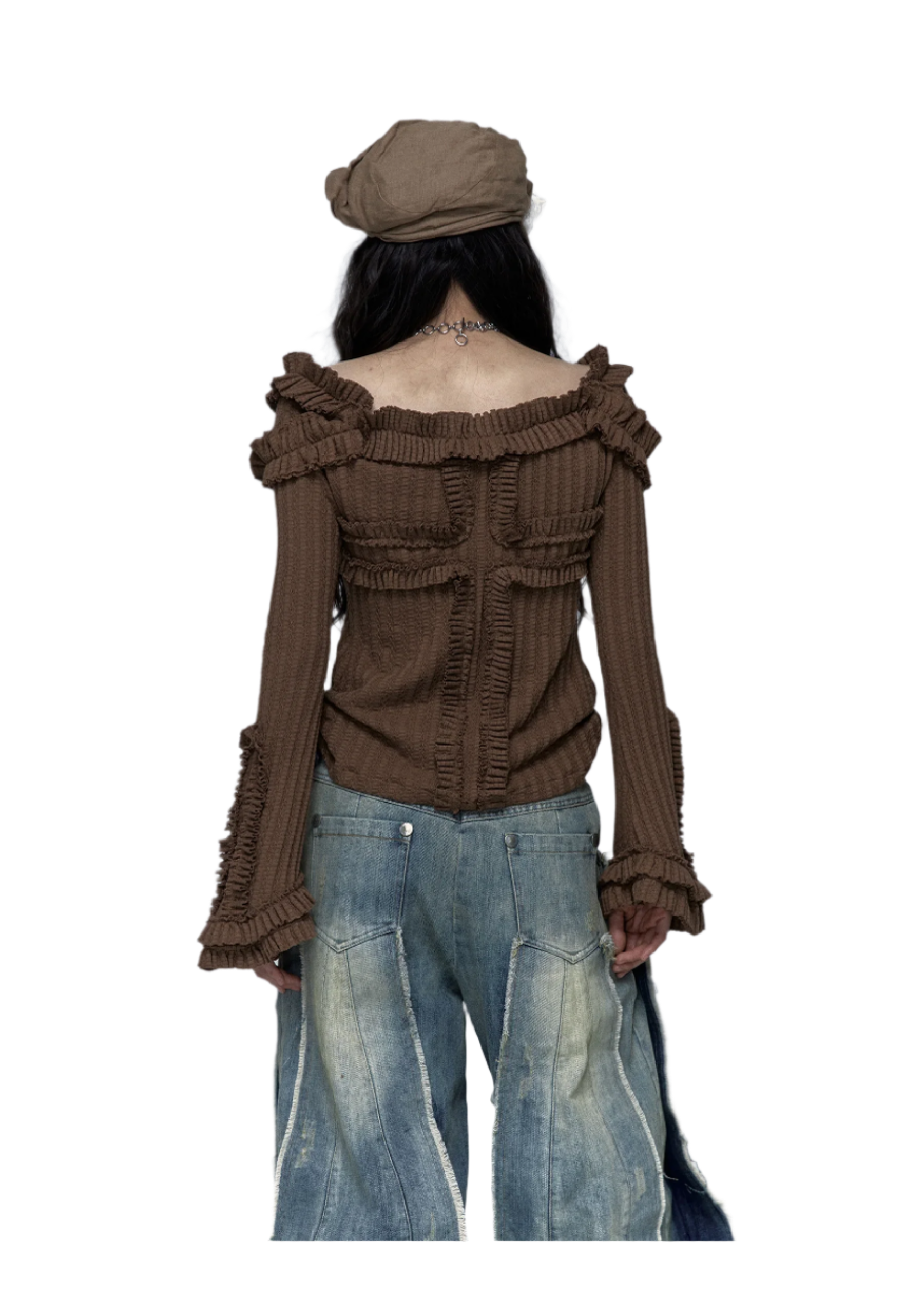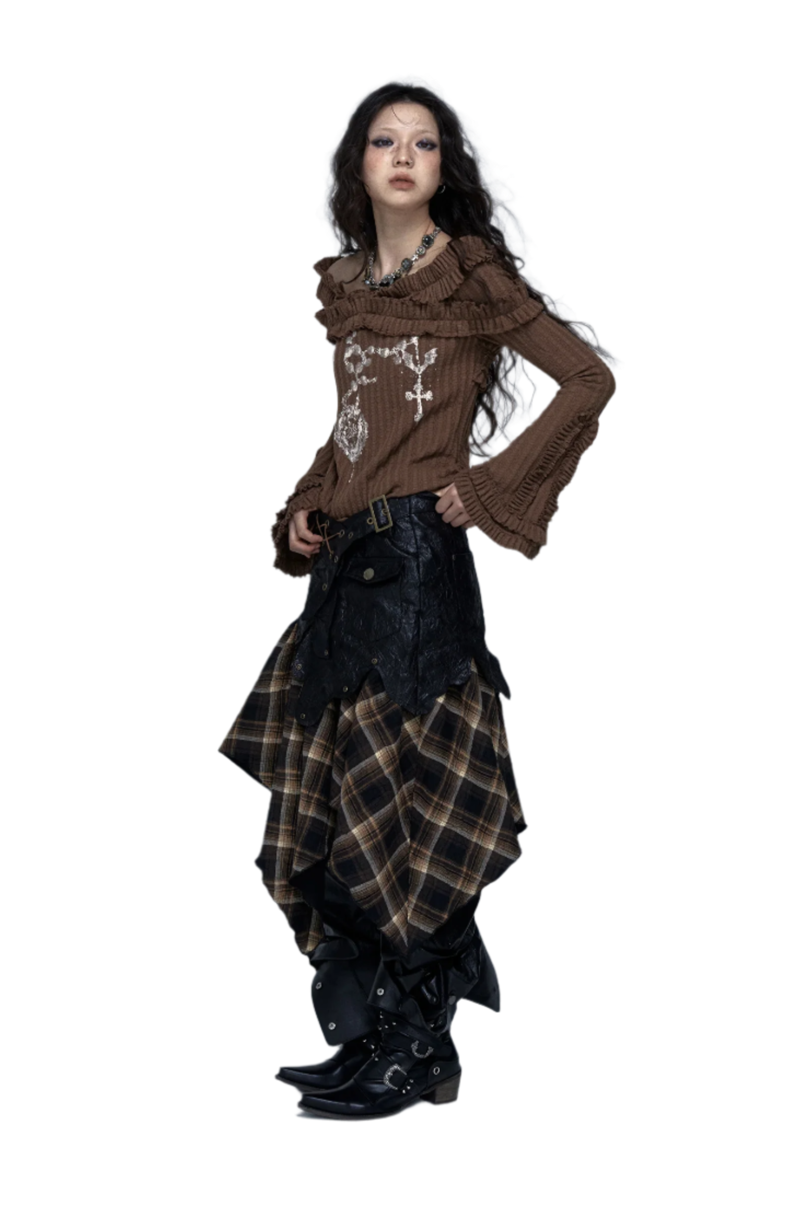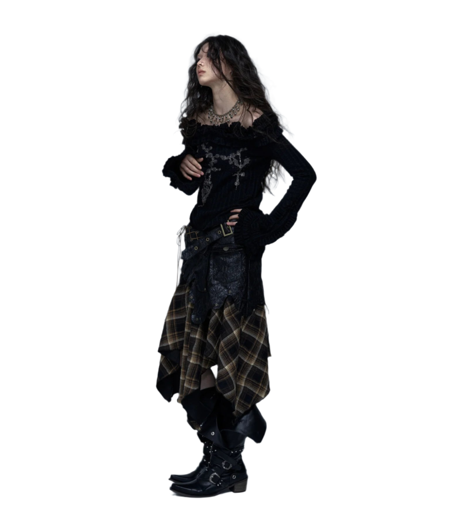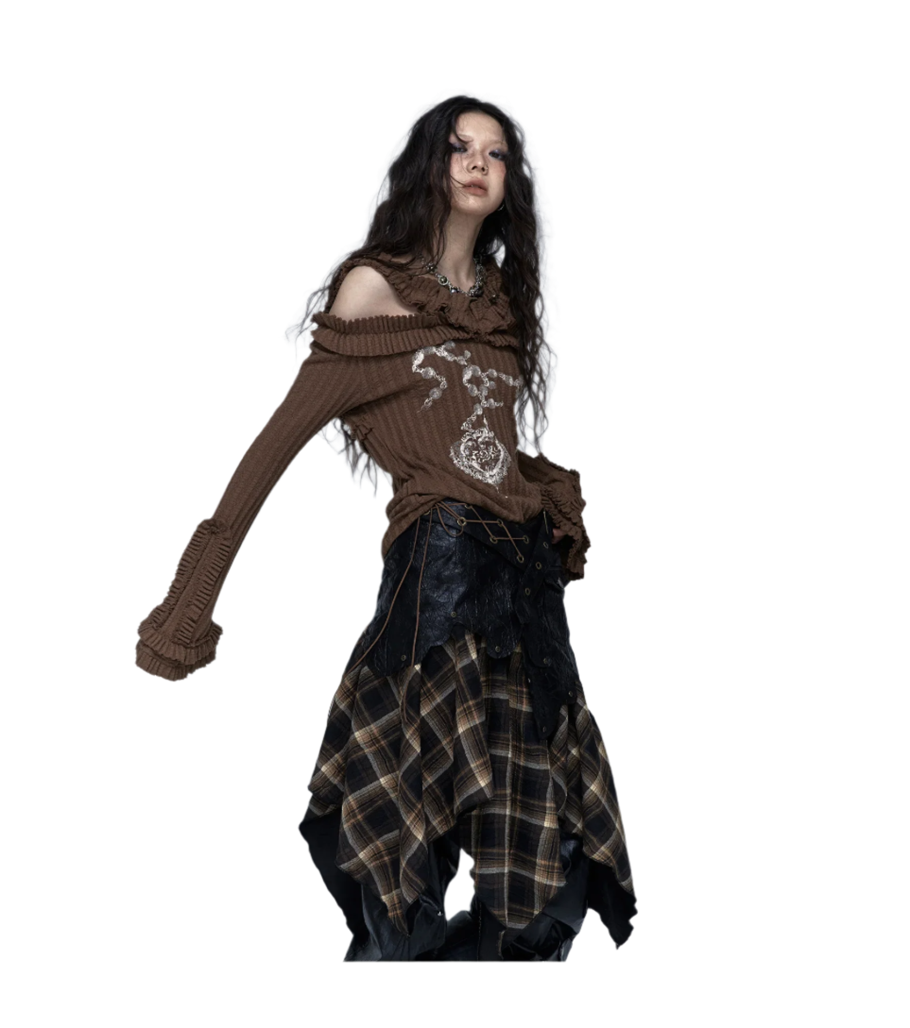 Embrace your inner rebel with this Off Shoulder Knitted Top! This totally rad slash neck tee features a vintage tattoo print on high-stretch cotton fabric. The ribbed black design with edgy hand-painted details gives major wasteland punk vibes. Perfect for your autumn/winter Y2K wardrobe with its full petal sleeves and gothic aesthetic. Slay all day in this ultra-stretchy, regular-length piece that's giving pure early 2000s energy!