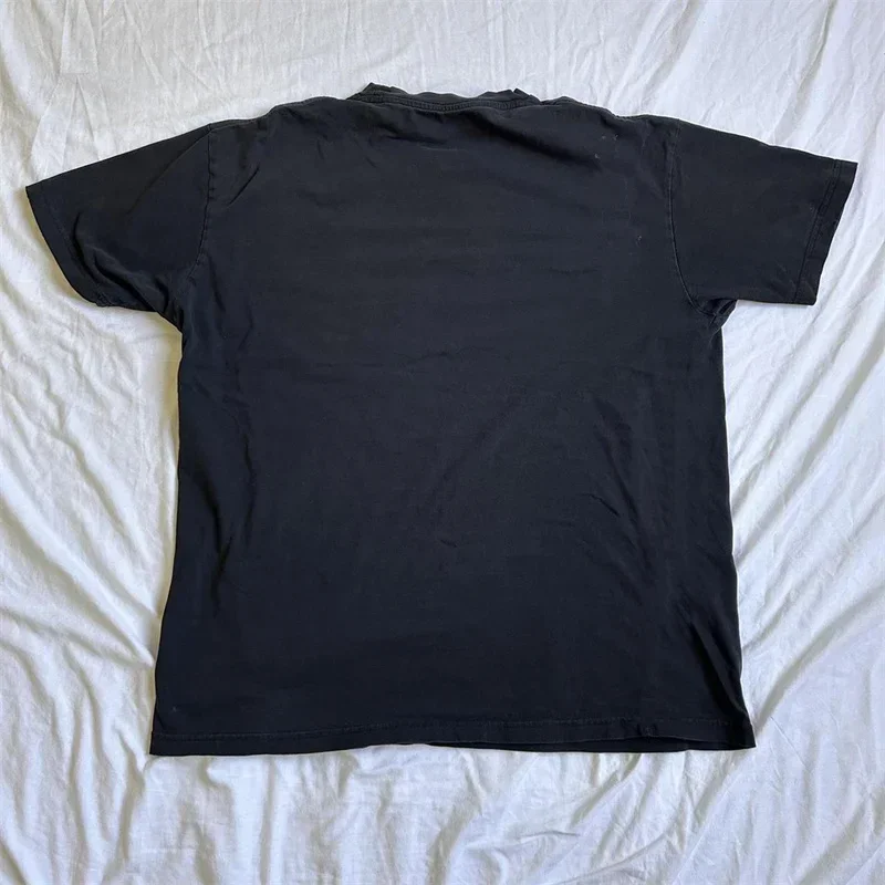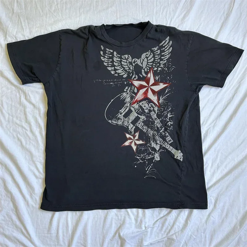 Edgy oversized tee with angel wings, large grunge red star, and cyber punk tattered art of guitars. Made from cotton with slight stretch. Perfect for summer street style - rock this casual crew neck with your punk-inspired looks.