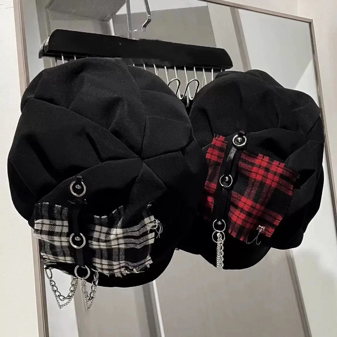 Edgy punk-gothic beret hat with plaid patchwork design. Perfect for casual spring/autumn streetwear. Features decorative chain details in true Y2K aesthetic. Made from acrylic/polyester blend. Unisex dome-style cap that screams grunge attitude.