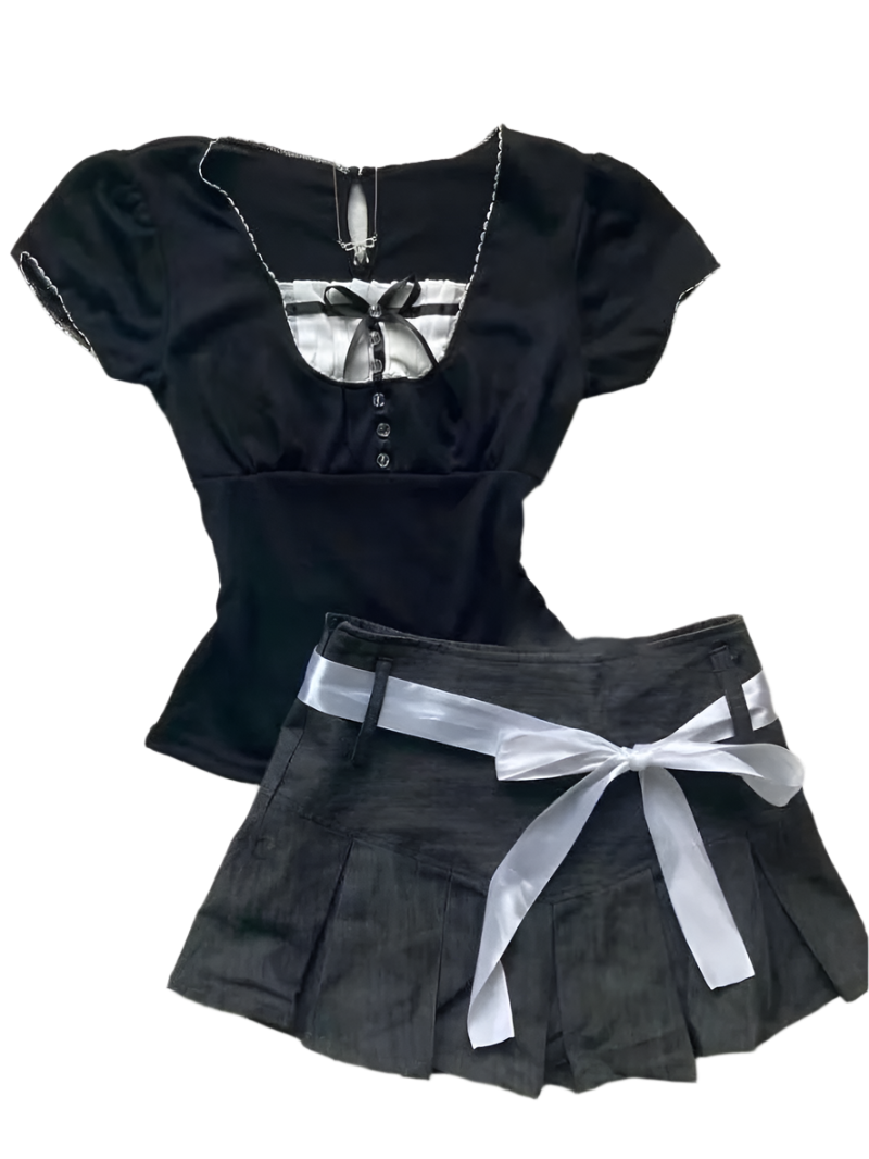 Polyester Jersey two-piece set featuring U-neck cute shirt with contrast color splicing and pleated skirt. Pullover design, totally giving Y2K Harajuku vibes! Perfect for any season, this set serves major office-toparty realness. Junior sizing. No high-concern chemicals.