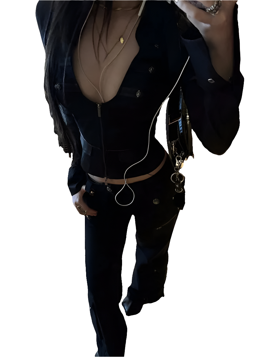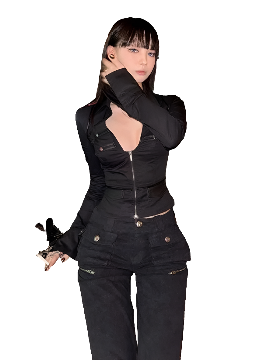 Unleash your inner rebel with this Y2k-inspired black crop blouse. Features dual zippers for adjustable sexiness, slim-fit silhouette, and V-neck design. Perfect for streetwear enthusiasts who crave that vintage grunge aesthetic. Made from cotton-poly blend with slight stretch for comfort while making a bold statement.