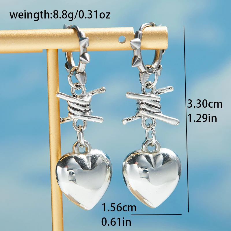 Edgy heart-shaped hoop earrings with thorns. Made from zinc alloy metal in a bold Neo-Gothic style. Perfect for punk, goth, and grunge aesthetics. Fashion accessory for women embracing alternative Korean-inspired looks.