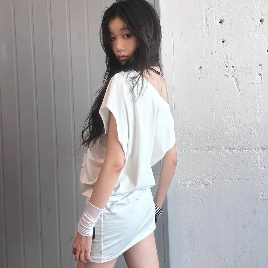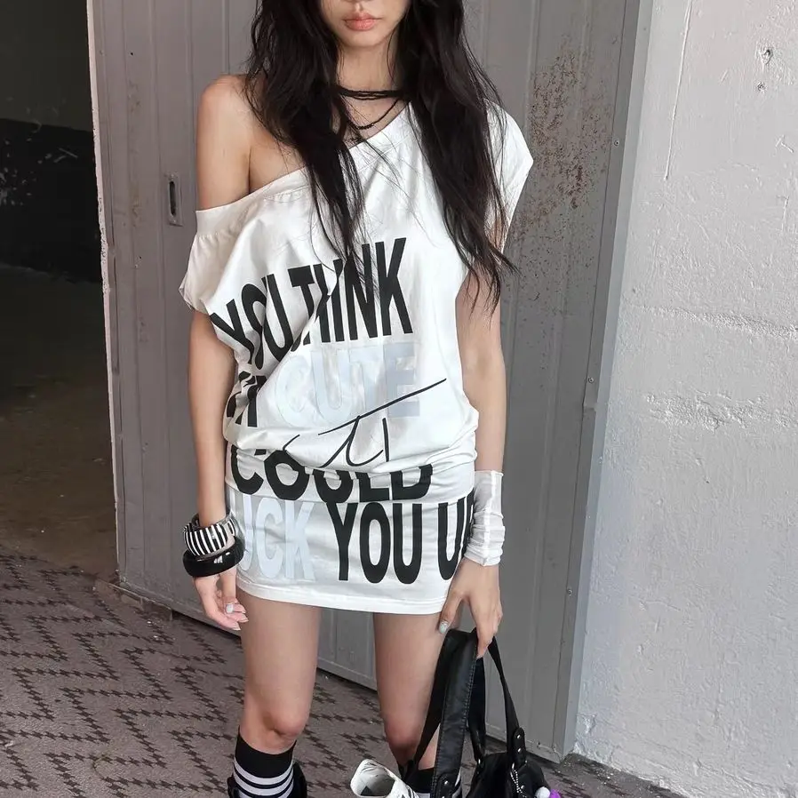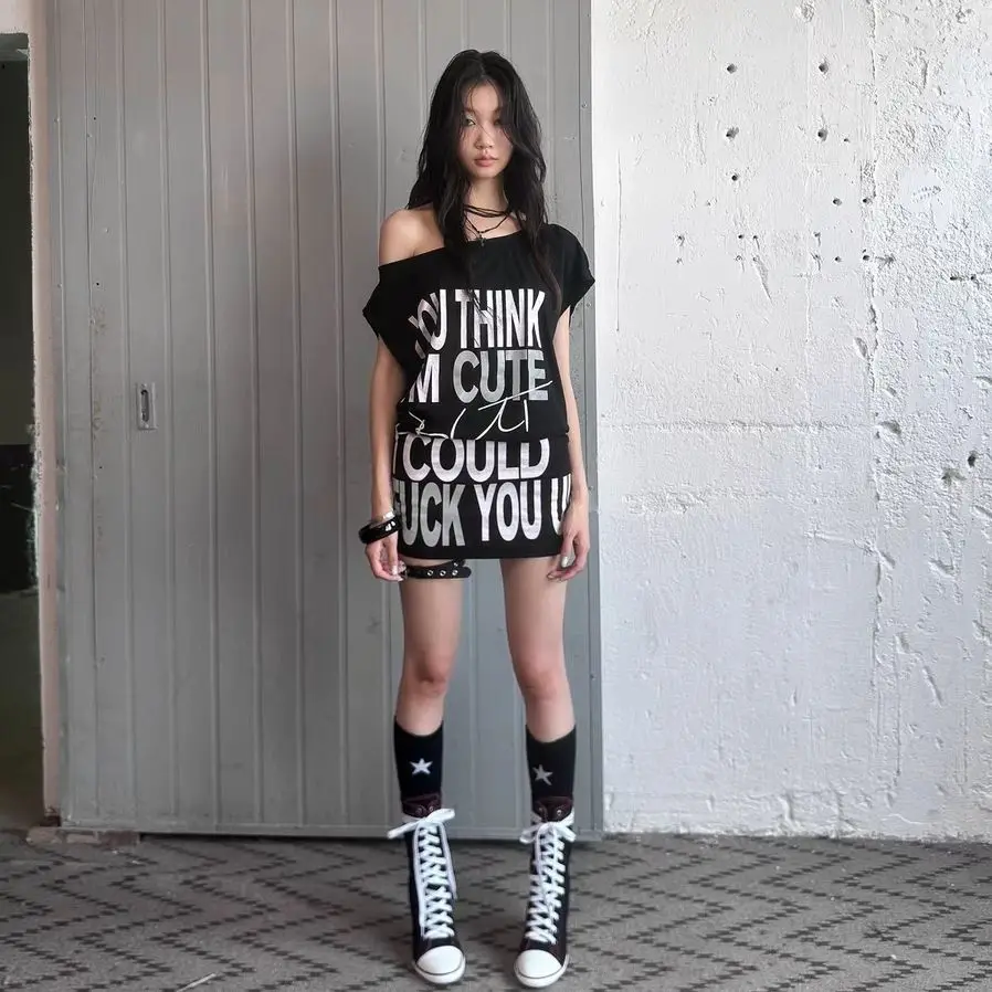 Mini T-shirt dress with a square collar and straight silhouette. Made from cotton/polyester blend with slight stretch. Perfect for summer streetwear with a loose, above-knee fit. Solid pattern for versatile styling.